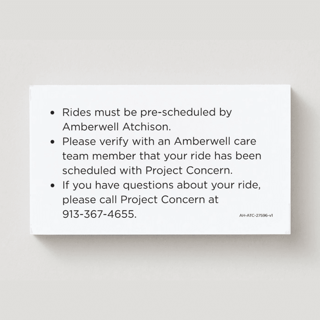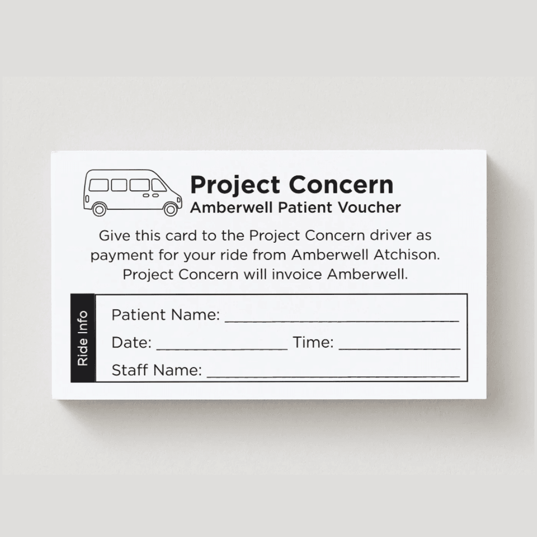 Write the patient’s name, date, and scheduled time (if known) on the card and give to the patient after the ride has been scheduled. Project Concern will invoice Amberwell Atchison for the rides given.