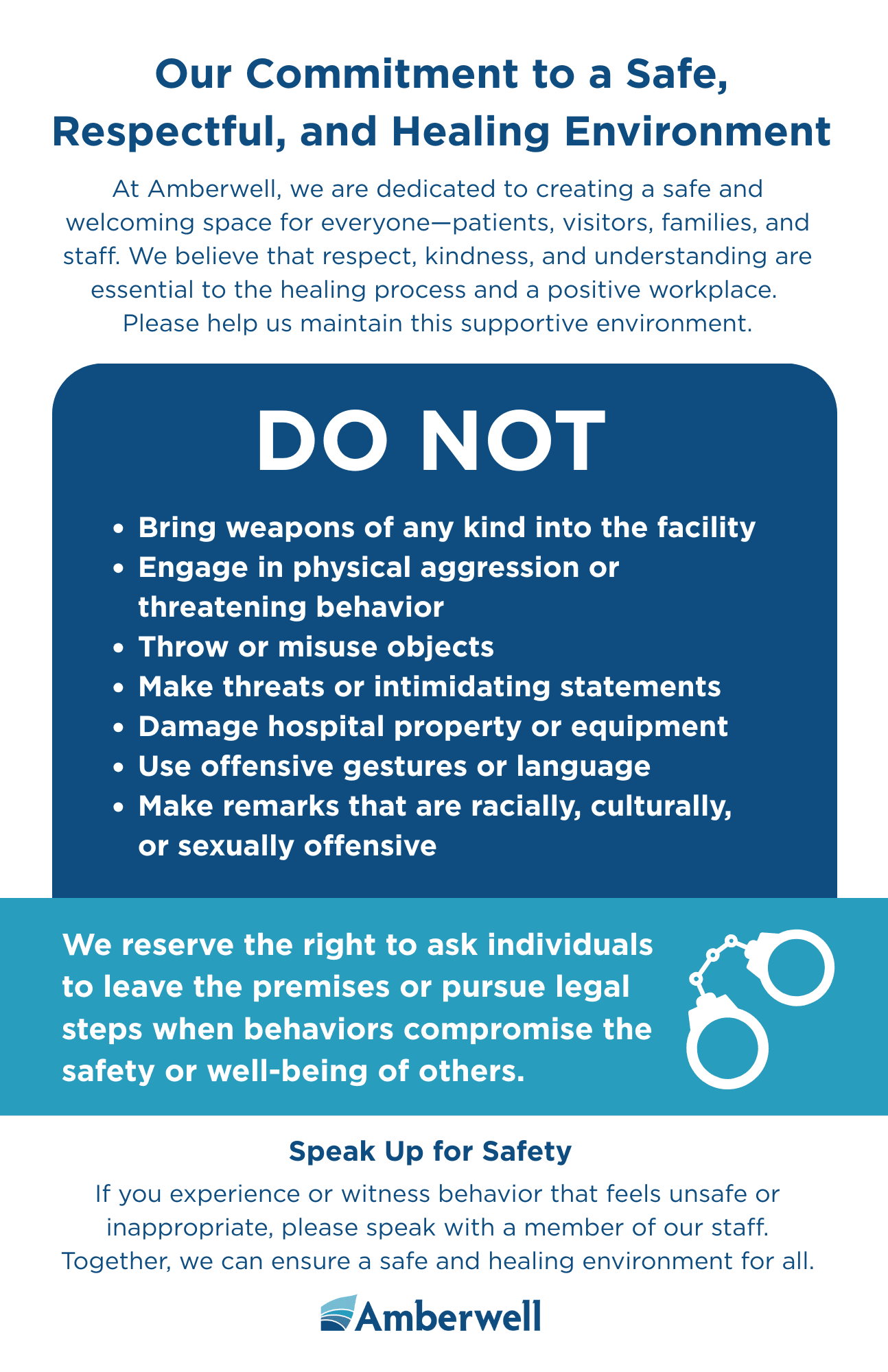 These signs can be posted in patient care areas to remind patients and staff of our commitment and expectation of a safe care environment. The signs are permanent, heavy weight styrene and come with hook and loops on the back for attaching to the wall. This sign is a 11×17, but a smaller 8.5×11 is available.